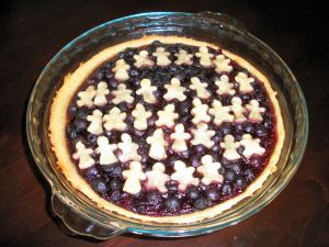 Holly Hornblower certainly does make one tasty pie. In the game she uses that fabulous pie crust and blueberry pie filling. Blueberry pie filling takes honey and blueberries. Well, I decided to add a bit of naughty to this pie. Blueberries are awesome with a bit of spice so after taking a sniff of the chai tea I was thinking of having with this pie, I added some chai inspired spices right in that filling. The end result is a tasty venture away from the same old blueberry pie…perhaps this is why those Hornblower pies are in such high demand! The unspoiled ones ofcourse. I had a lot of fun making the topper design for this pie too. We figured it takes a village to make a pie this tasty…so we put the village on the pie. Buahaha. More fun than lattice work and my wife came up with scandalous stories for some of the residents of this pie. Tsk, tsk some hobbits.