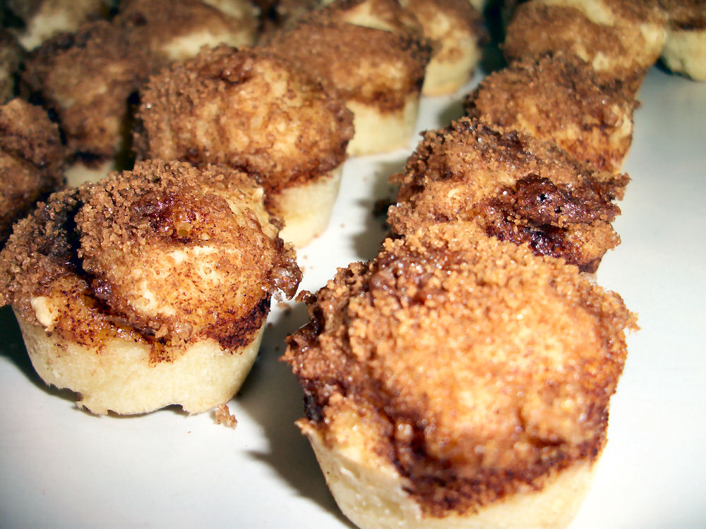 - In a ramekin combine the brown sugar and cinnamon. Top each mini bite with a half tsp of the cinnamon mixture. Using a toothpick swirl the mixture into the bite.