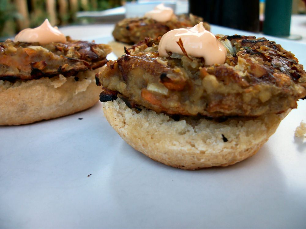 A few weeks ago my wife and I went out to a vegetarian restaurant with some gaming buddies of ours called Rebar. You may have heard of them, they have a cookbook that many people swear by. I ended up ordering their almond burger. It was quite tasty and did not disappoint….especially with it’s topping of aioli and alfalfa sprouts. I love alfalfa sprouts…my dad used to call them frog hairs…which made me love them more…I was a very strange little girl. I remain a very strange girl of course. I had been toying with the idea of a lentil slider for some time and this burger inspired me to add almonds. I loved the texture that the almonds in their burger gave. It definitely was that last missing touch to the slider I’ve been aiming for. So, thank you Rebar for the inspiration! Remember, it is good for yourself and the environment if you have at least one meat free meal a day.